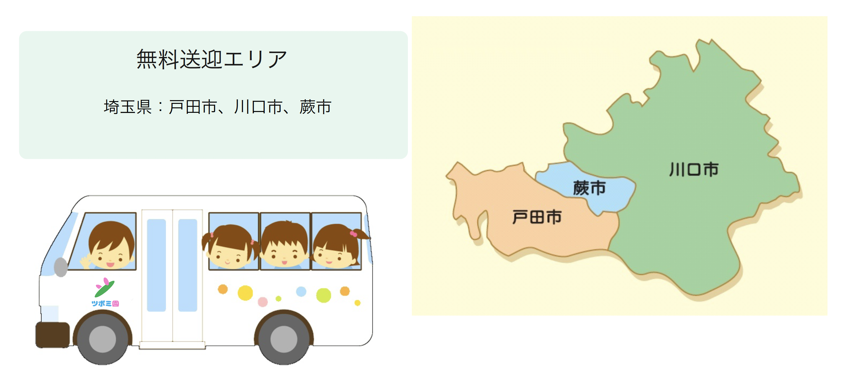 当園では、戸田市・川口市・蕨市を対象に無料送迎サービスを行っています。ご自宅や学校までの送迎に対応し、安心して通っていただける環境を整えています。なお、具体的な送迎ルートや時間については、ご利用時に詳しくご説明いたします。